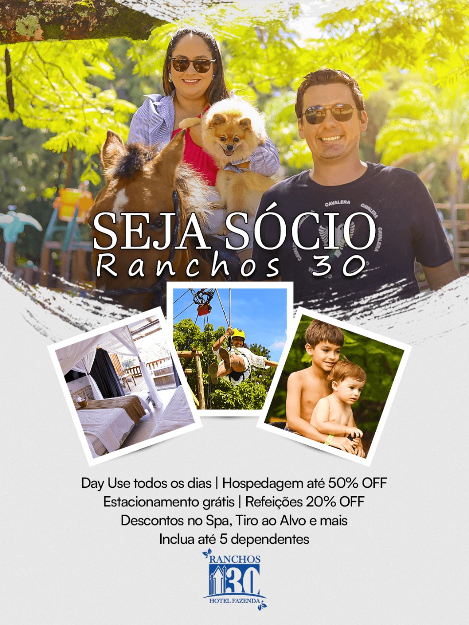 Imagine ter acesso ao Ranchos 30 sempre que quiser: aproveitar o nosso Day Use todos os dias, descansar em chalés aconchegantes com até 50% de desconto e ainda contar com vantagens exclusivas para toda a família.